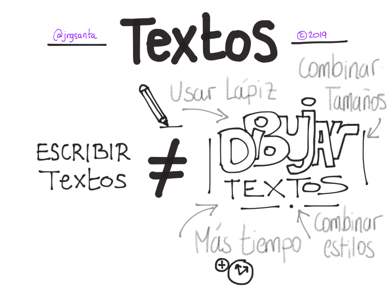 En particular, dibujar Texto requiere de mucho más tiempo de confección. Entre otras razones, no deberíamos de comenzar con marcadores sin haber preparado antes un boceto a lápiz. En encuentros o grupos de trabajo, el tiempo que nos llevará implica que podemos perder en el proceso de creación ideas o conceptos que se estén produciendo en ese mismo momento. Esto nos lleva a que dibujar Texto, puede ser una técnica utilizada en una fase de refinamiento de nuestras piezas de Visual Thinking.