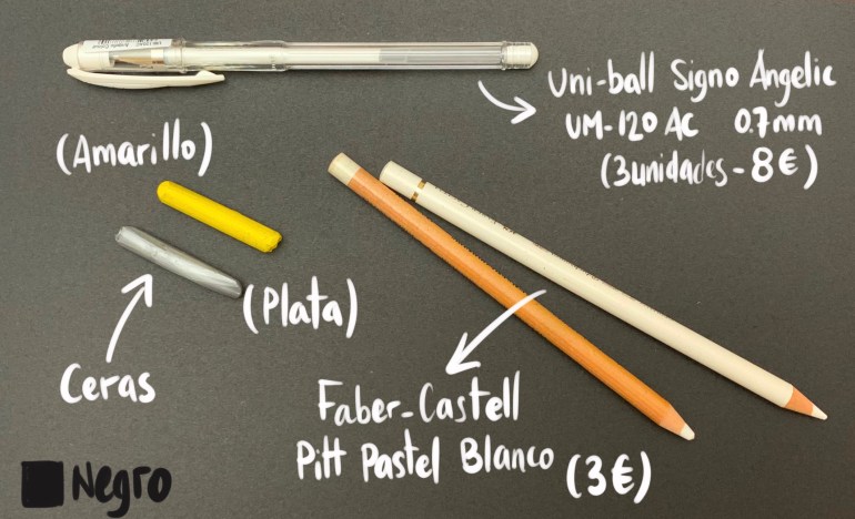 Como podéis ver se pueden utilizar ceras de color cálido como el amarillo, el color plata también da muy buen resultado. Utilizaré también lápices blancos y un marcador gel de 0,7mm.