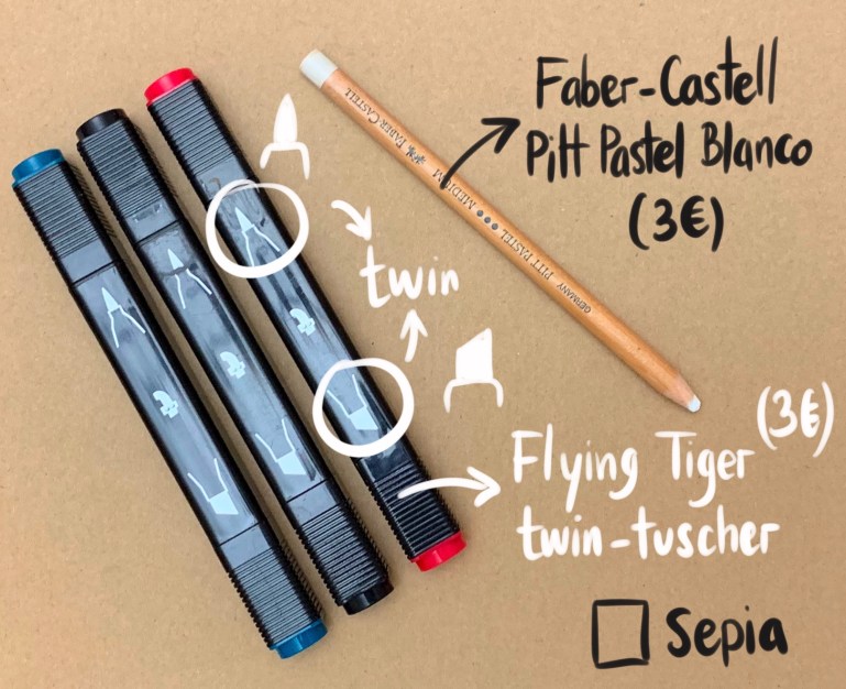 Para hacer sketch sobre superficies de colores oscuros lógicamente tenemos que cambiar nuestros esquemas de color, en estos casos el color principal pasa a ser el blanco. Veamos cuales son los marcadores que voy a utilizar para hacer un sketch sobre color negro.