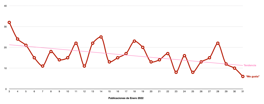 - «Me gusta«: La media de «Me gusta» en las publicaciones de 2021 estaba en el valor de 28 ❤️. Sin embargo, en mi #Reto2022 la media del mes de enero ha sido de 16 ❤️, lo que representa una buena caída.