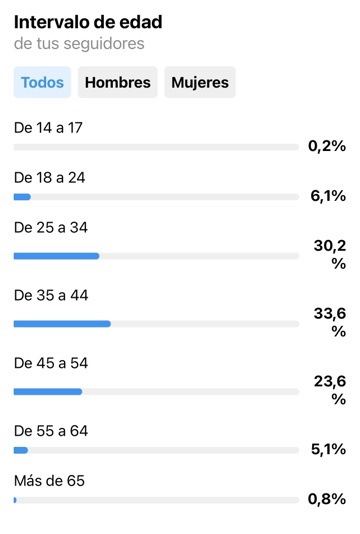 Estos datos son muy interesantes, ya que mas del 65% de mis seguidores son mujeres que tienen entre 25 y 54 años, y debería de adaptar mis contenidos a los gustos de mis seguidores principales.