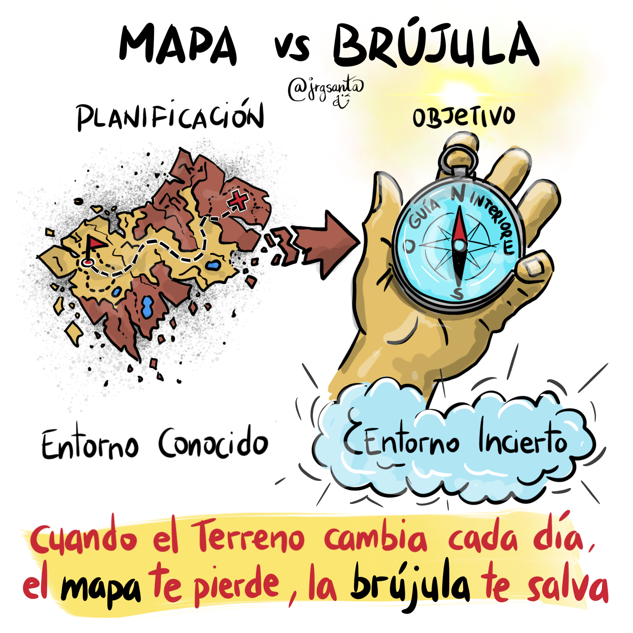 Una brújula no te da instrucciones paso a paso. No te dice si te vas a encontrar un río o una montaña. Lo único que hace es señalar el Norte.