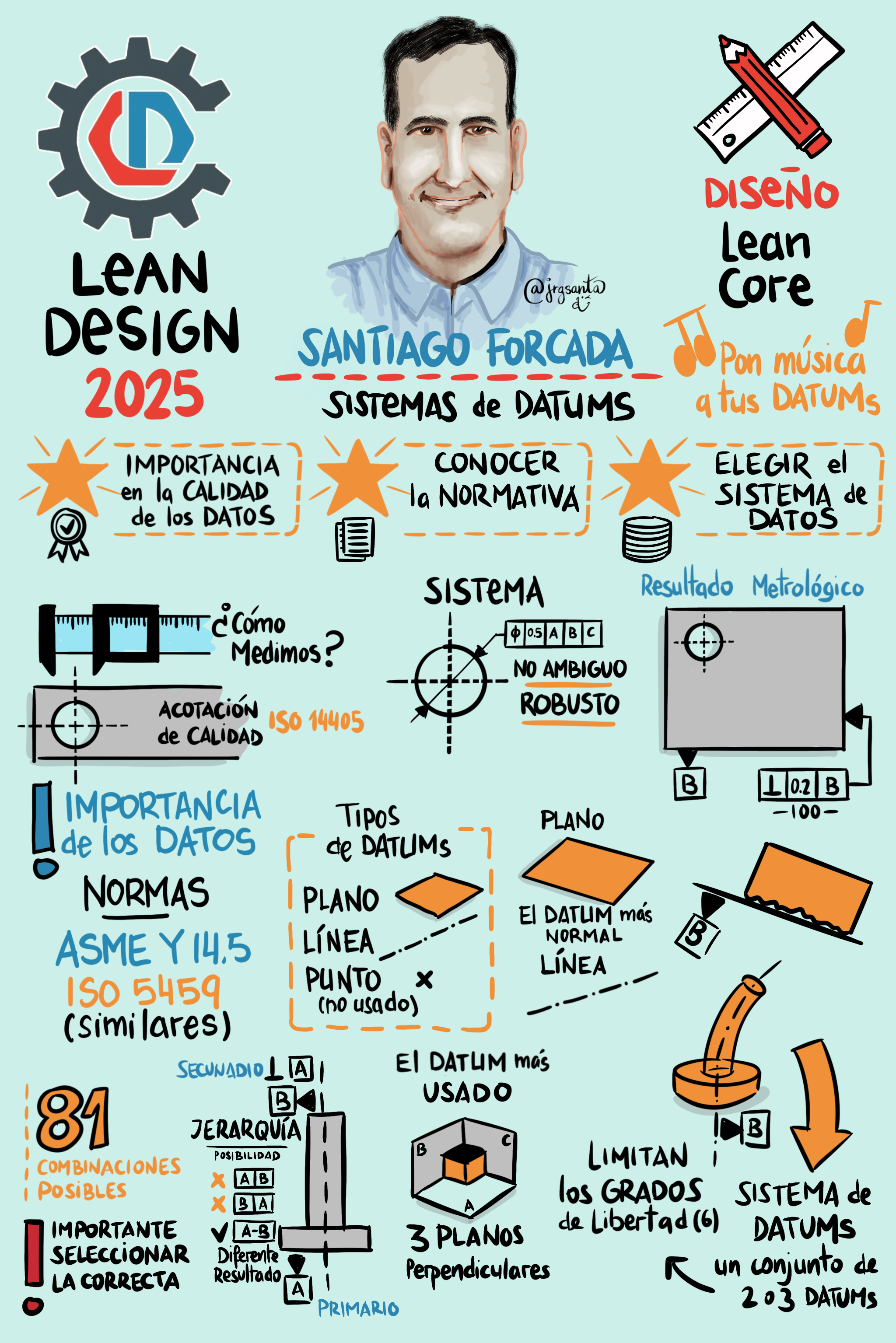La ponencia de Santiago Forcada Pardo en el CLD Lean Design sobre Sistemas de DATUMs, quedo resumida de forma impactante con la inspiradora frase «Pon música a tus DATUMS«, con la que Santiago remarco la necesidad de armonía y precisión en la definición de las referencias geométricas en el diseño de producto. Un sistema de DATUMs bien definido es fundamental no solo para la calidad intrínseca del producto y la comunicación sin ambigüedades entre los equipos de diseño y producción, sino también para la eficiencia en la fabricación, la reducción de costes por retrabajos y el cumplimiento de las tolerancias funcionales críticas. Esta filosofía quedo perfectamente alineada con los principios de la Metodología de Capas Lean Design que Víctor Elviro Domínguez nos presento en la ponencia anterior del evento y Keynote del CLD Lean Design , enmarcándose dentro de la capa Core de la Metodología.