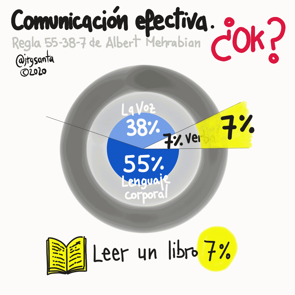 Al leer un libro (componente verbal) tan sólo dispondríamos de un 7% de efectividad en la comunicación y por lo tanto escribir un libro no parecería ser la mejor forma de comunicar. ¿Tiene sentido? No, ¿verdad?