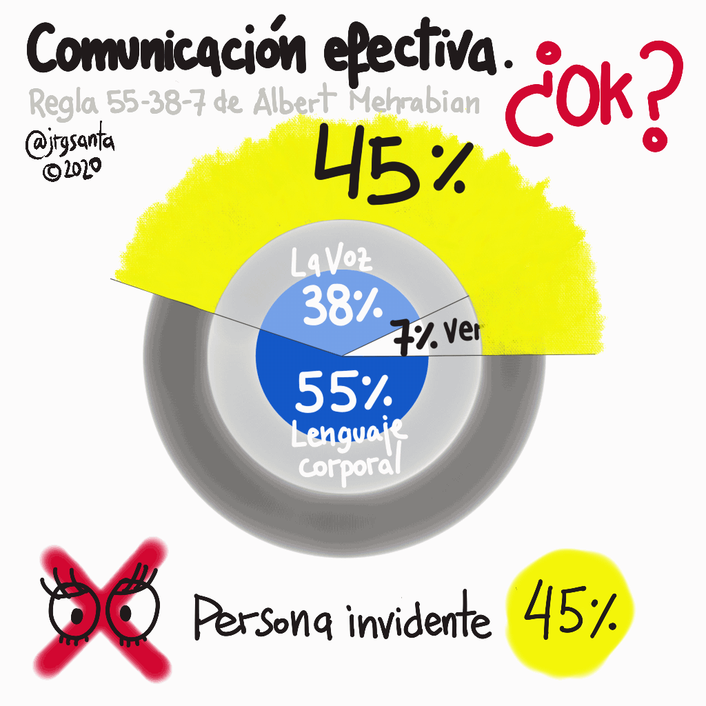 Estamos en un momento de aprendizaje, muchas personas no se sienten cómodas con la cámara y prefieren tenerla apagada, pero eso resta el componente de Lenguaje Corporal y nos obliga a esforzarnos en los otros dos componentes. Dominar la tecnología y el uso de la cámara nos permite volver a integrar gestos, postura y mirada en nuestra comunicación y con ello mejorar de forma importante la efectividad de nuestra comunicación.