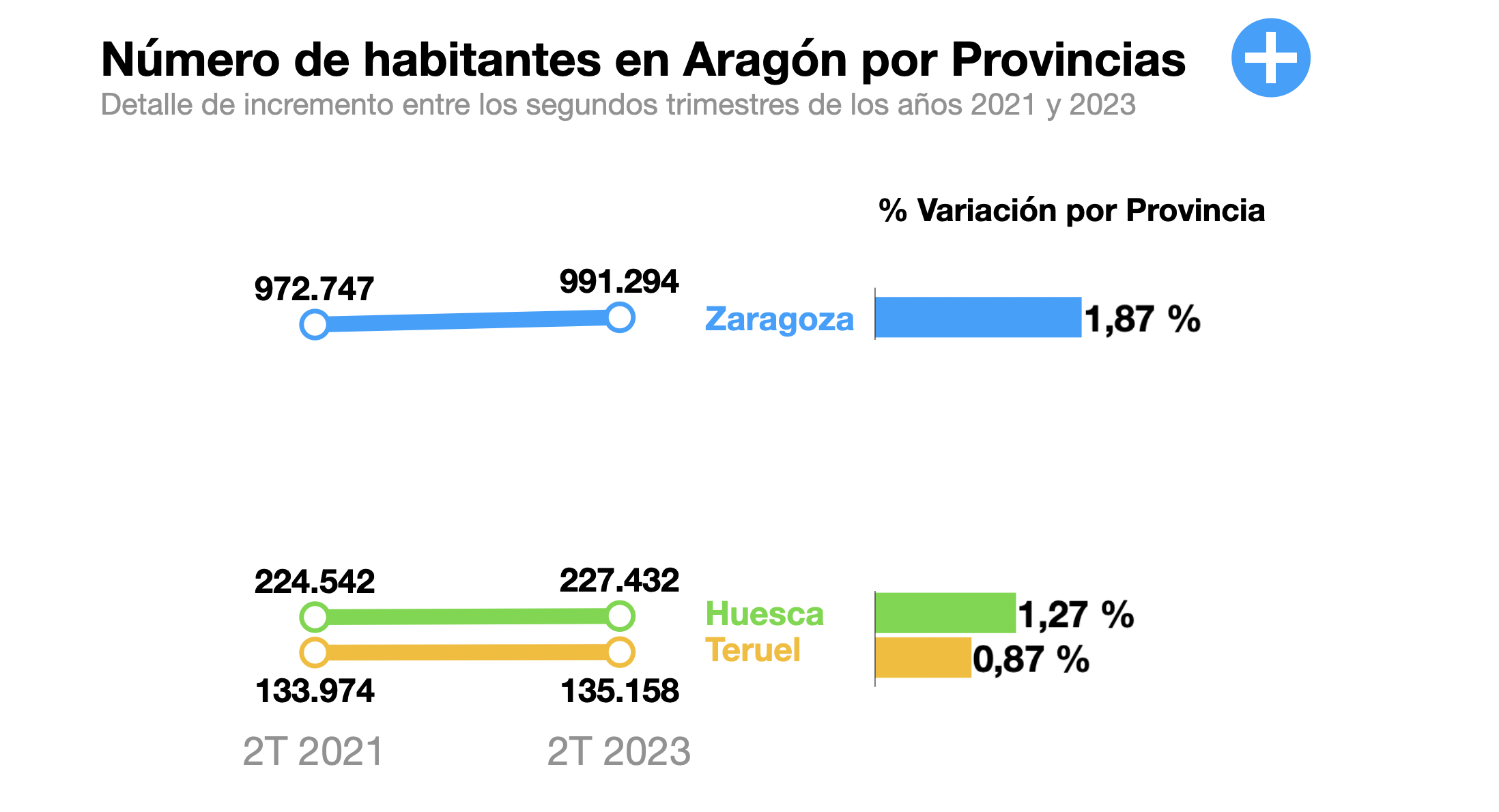 Hoy (9 de agosto de 2023 en el Heraldo de Aragón) me he encontrado con una noticia que nuevamente me ha llamado la atención. El artículo trataba en este caso de la variación del número de habitantes en Aragón, e ilustraba la noticia con dos gráficas que a mi juicio ni son la mejor elección, ni probablemente las más adecuadas para ilustrar la noticia. Vamos a comenzar viendo la noticia «Aragón registra otro récord de población al sumar 2.068 habitantes en tres meses«