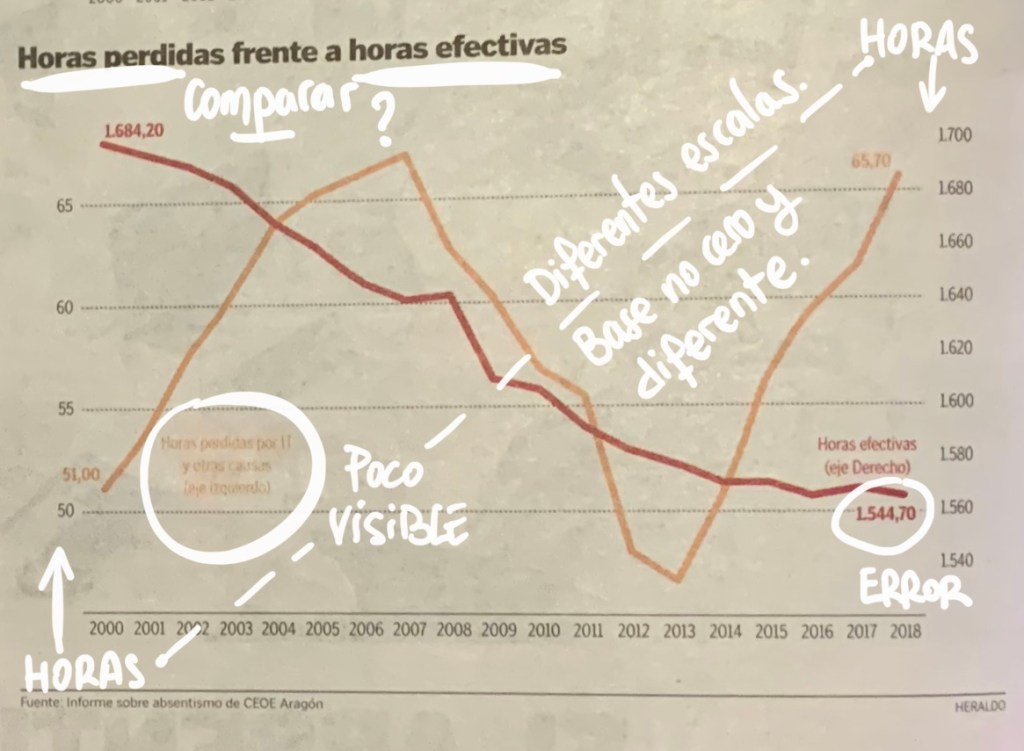 - El título. “Horas pérdidas frente a horas efectivas”. En serio se pretende comparar ambas con este tipo de gráfico. Esto tan sólo nos lleva a un engaño visual flagrante. Podría tener una pequeña disculpa el incluir las escalas de los ejes, pero no todo el mundo sabe interpretarlas.