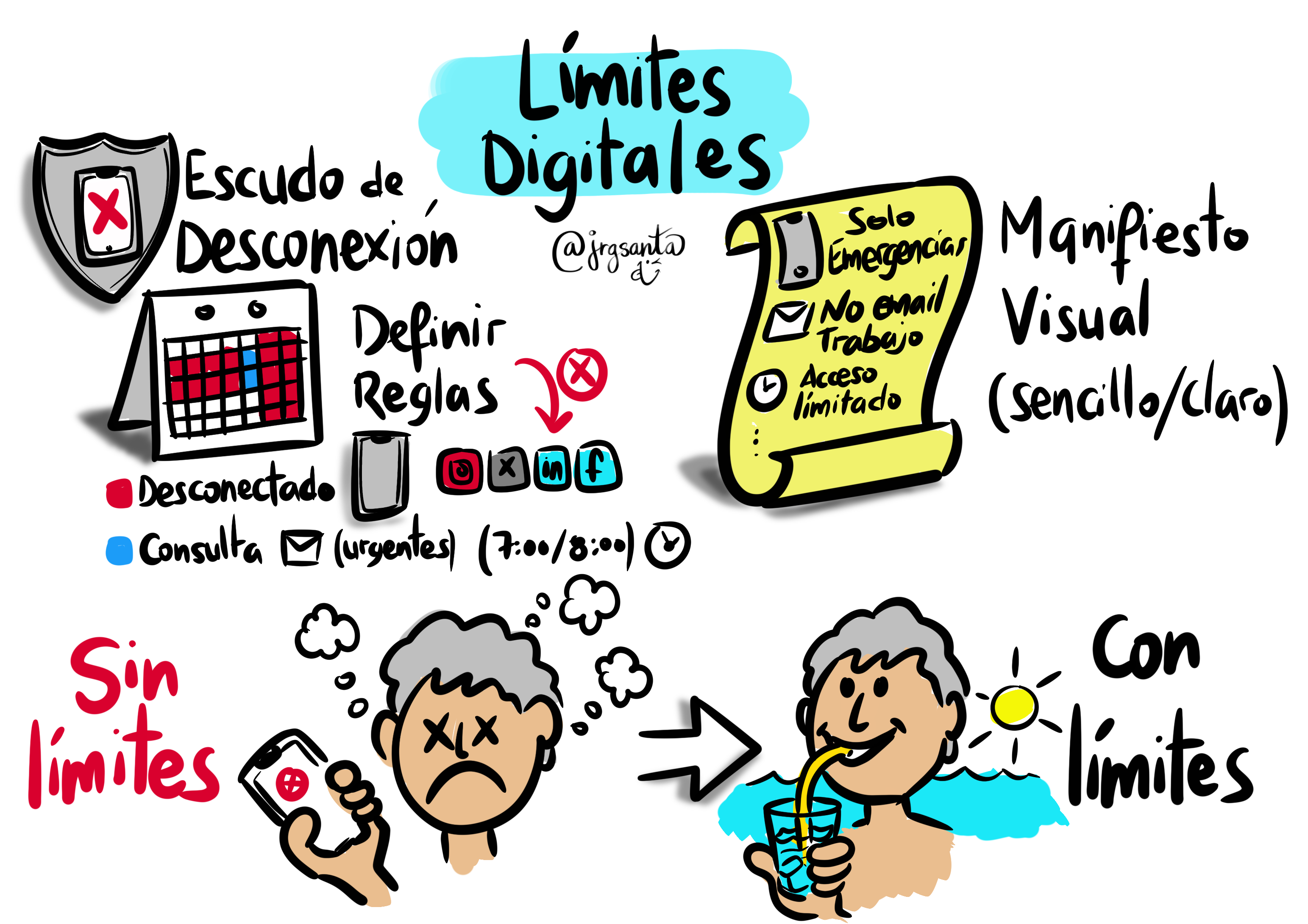 Comparte tu «Manifiesto Visual»: Puedes dibujar un pequeño esquema o una infografía simple que muestre a tu equipo y a tu familia tus «reglas de desconexión»: «Solo emergencias por llamada», «No emails de trabajo», «Horas de acceso limitado». Al ser visual, es más fácil de entender y recordar que un texto largo.